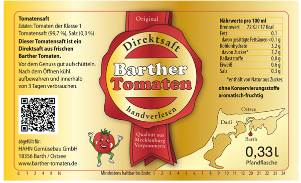 Unser Barther Tomatensaft wird aus frischen, vollreifen handverlesenen Tomaten hergestellt, ohne Konzentrat und Konservierungsstoffe, er enthält deutlich mehr Lycopin als frische Tomaten.